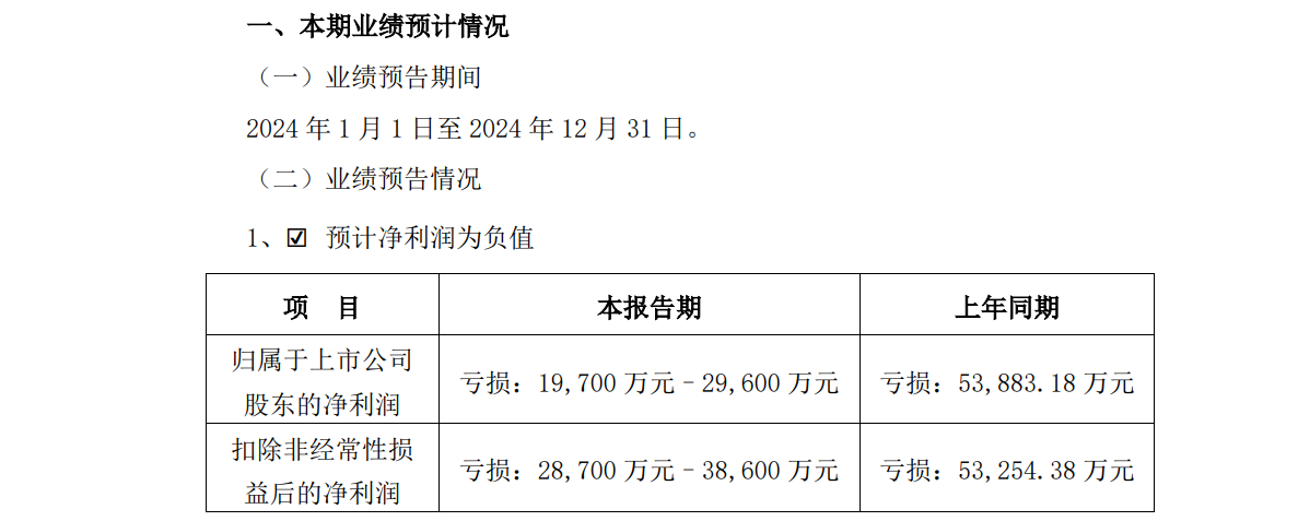 华谊兄弟昨晚发布的2024年业绩预告显示,公告预计2024年归母净利润亏损1.97亿元至2.96亿元,而上年同期亏损为5.39亿元。扣除非经常性损益后的净利润预计亏损2.87亿元至3.86亿元,上年同期为亏损5.33亿元。
