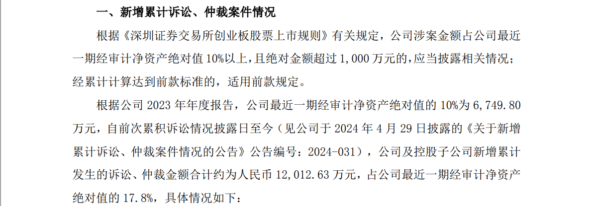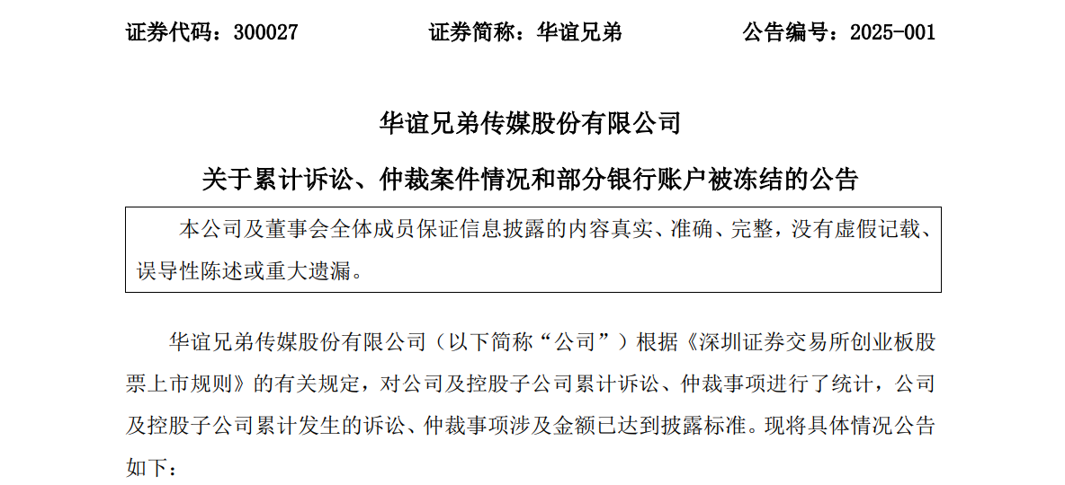 2025年1月17日,华谊兄弟披露的公告显示,自2024年4月29日披露的《关于新增累计诉讼、仲裁案件情况的公告》至今,上市公司及控股子公司新增累计发生的诉讼、仲裁金额合计逾1.2亿元,占上市公司最近一期经审计净资产绝对值的17.8%。累计诉讼、仲裁案件涉及公司、子公司及孙公司部分银行账户被冻结12个。
